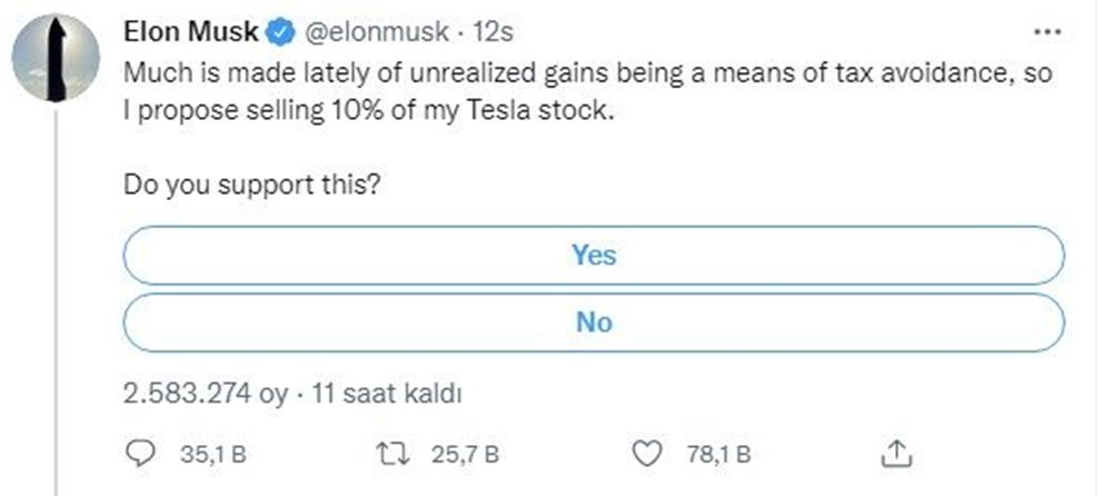 Bazen attığı Tweet’lerle, sanal coin’lerin değerini bir anda fırlatabilen veya düşürebilen Elon Musk, bu sefer de kendi hisseleri üzerinden karışıklığa yol açtı. 63 Milyon takipçisine, Tesla hisselerinin %10’unu satıp satmaması gerektiğini soran Musk, %57 oranında evet cevabını aldı.